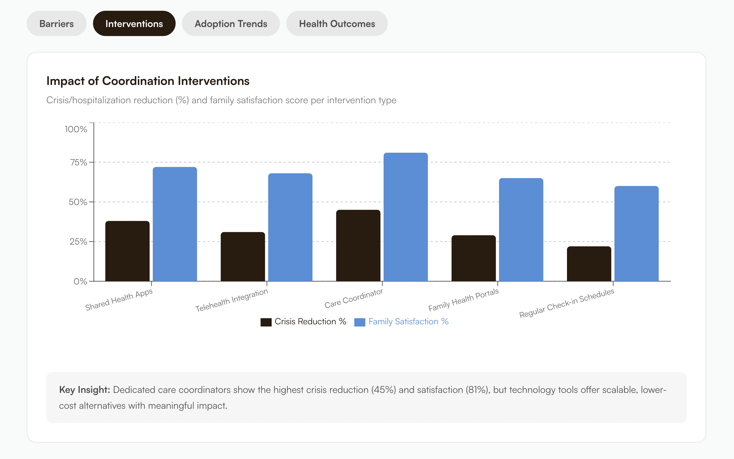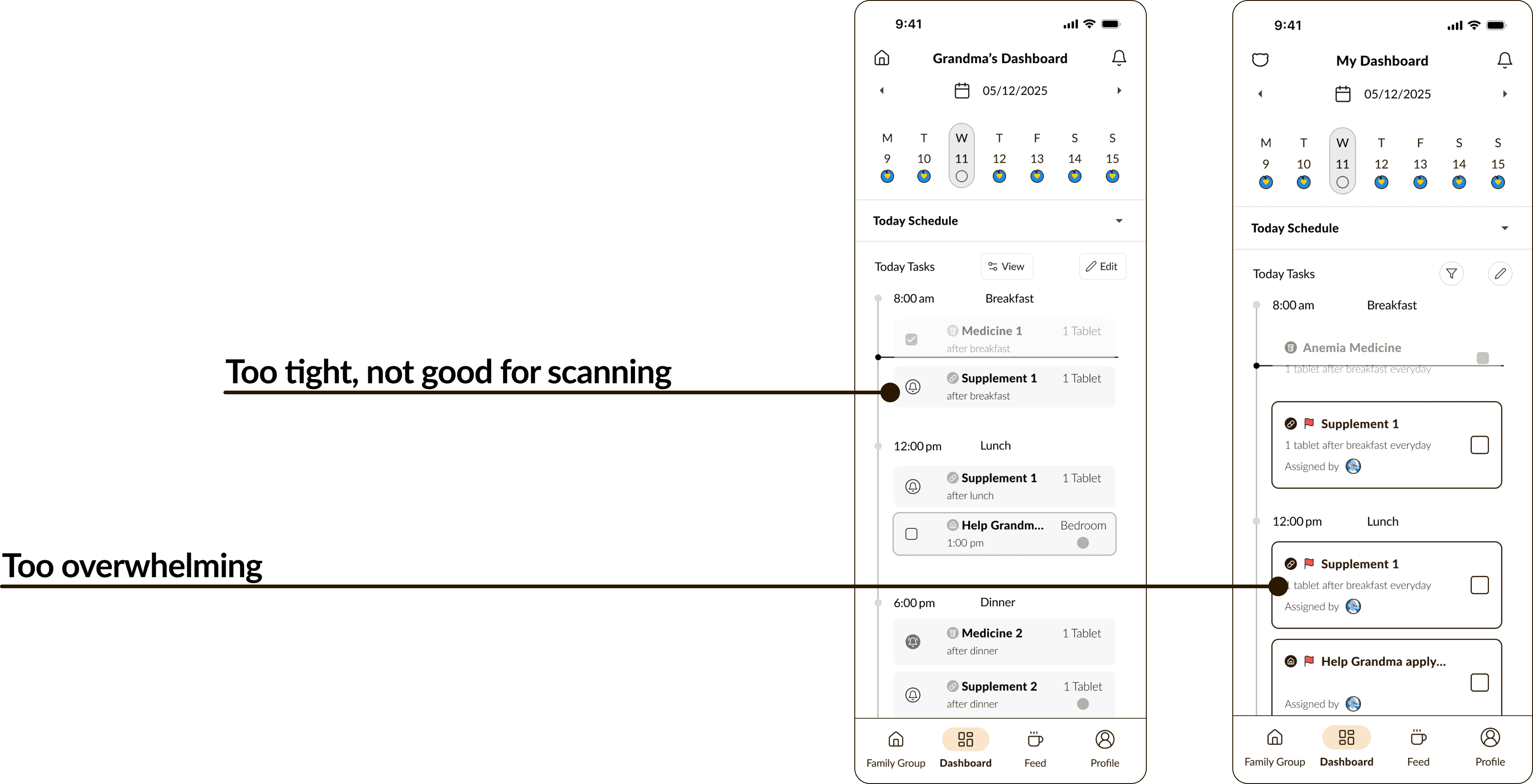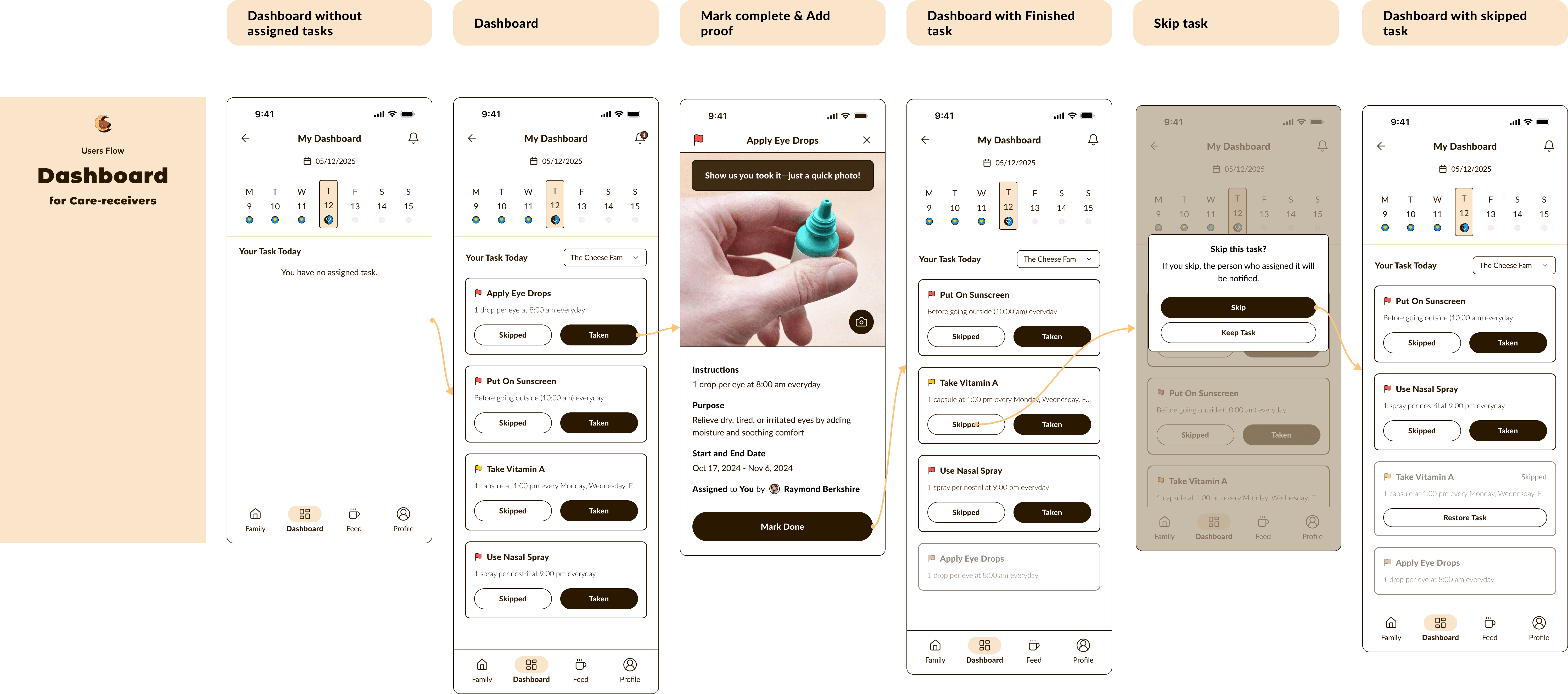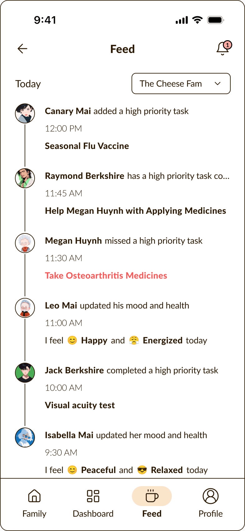 Dashboard gives each family member a clear, shared view of daily tasks, moods, and missed check-ins: making it easier to stay updated, prioritize care, and avoid communication gaps.
